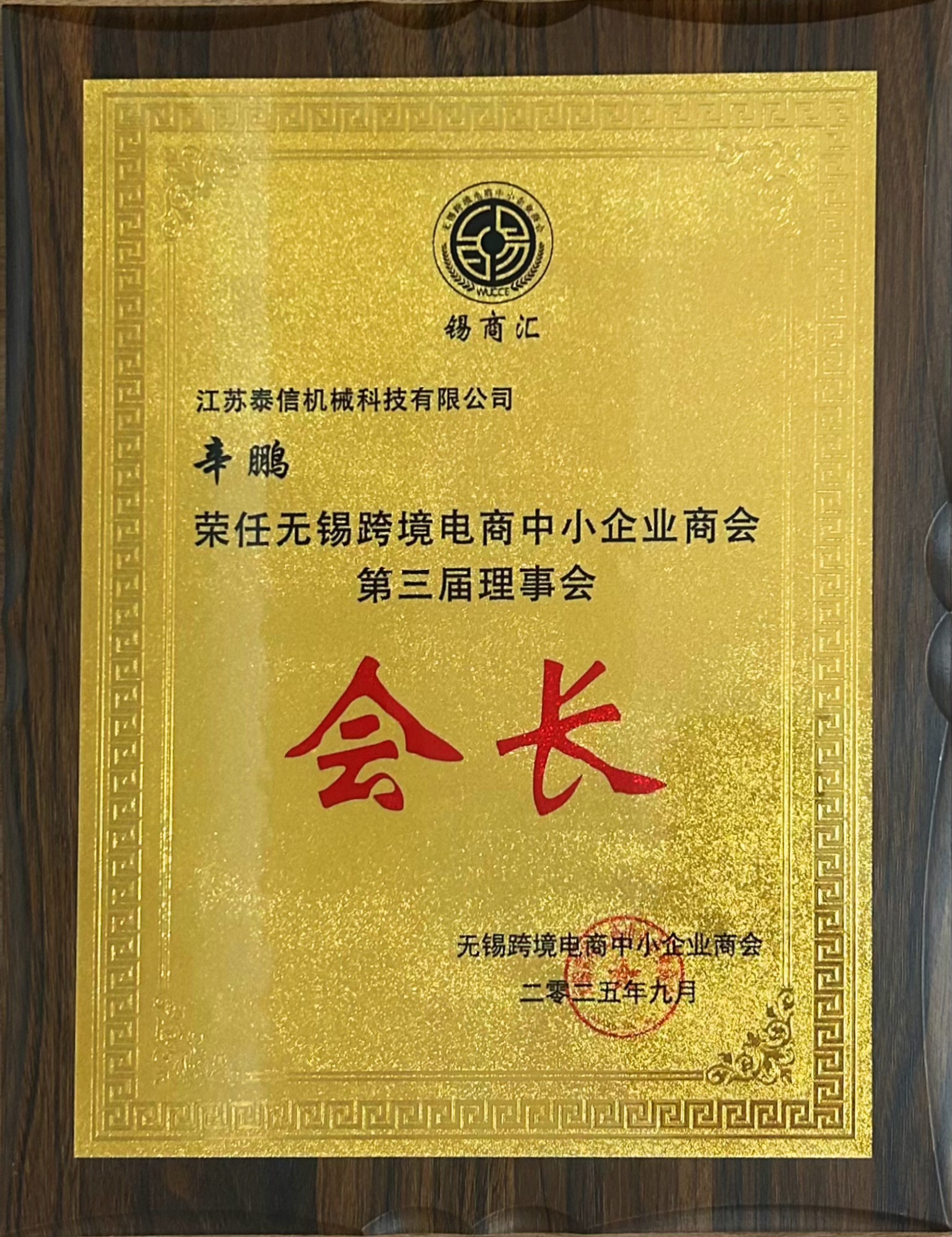 2025年9月12日,無錫跨境電商中小企業(yè)商會換屆大會暨成立十周年慶典在無錫君來洲際酒店圓滿落幕。江蘇泰信機械股份有限公司(以下簡稱“泰信機械”)董事長辛鵬,憑借在跨境制造領(lǐng)域的深厚積淀及與商會會員多年協(xié)同拓市的實踐口碑,經(jīng)無記名投票,正式當選商會新一屆會長。此次當選不僅標志著泰信機械將以行業(yè)領(lǐng)軍者身份推動產(chǎn)業(yè)融合,更開啟了泰信機械與商會、會員單位深度綁定、共同成長的新征程。
